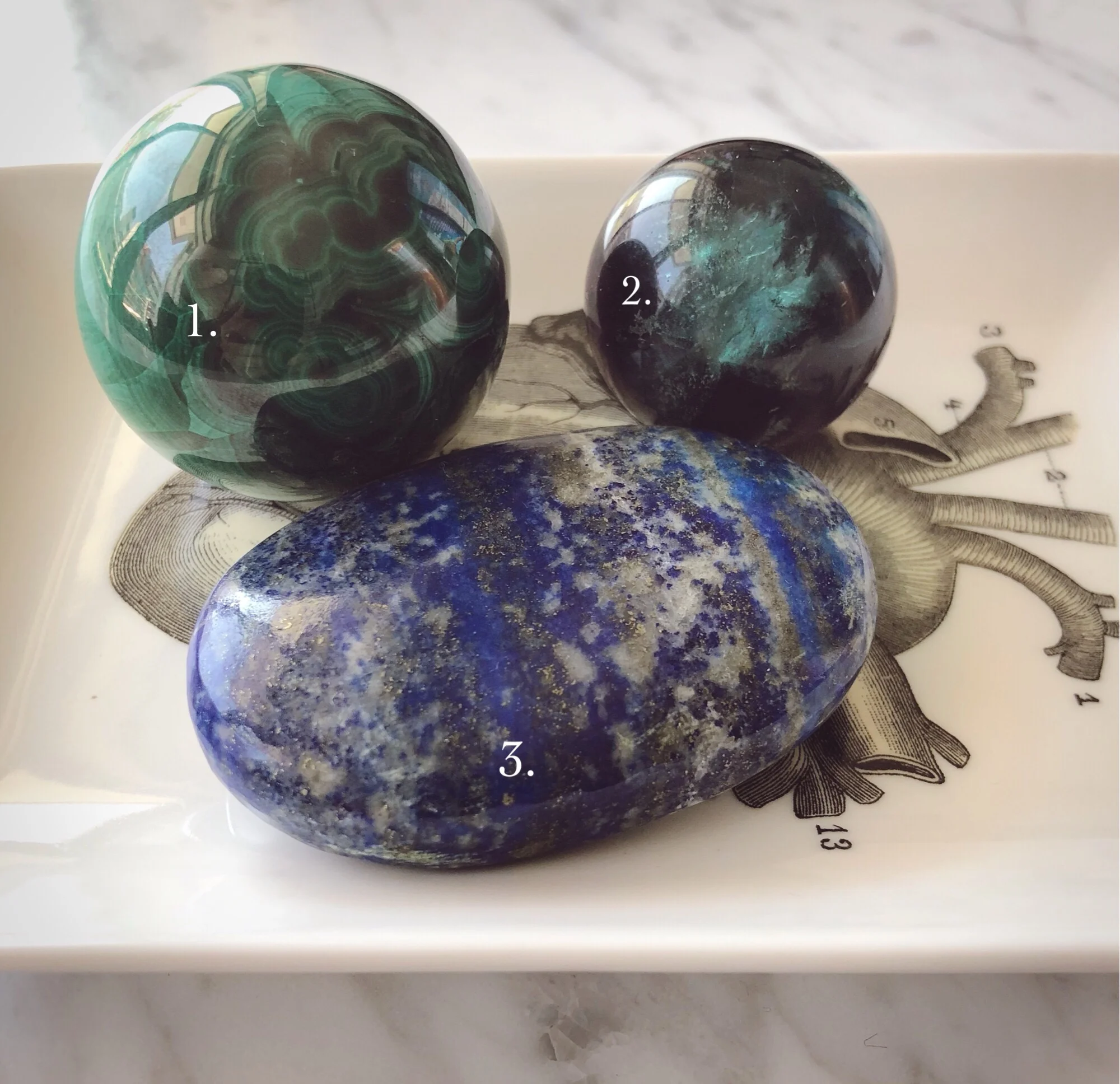1. Malachite sphere from Center for the New Age | 2. Rainbow fluorite from Peace Place (I think...) | 3. Lapis Lazuli palm stone from Mystical Bazaar