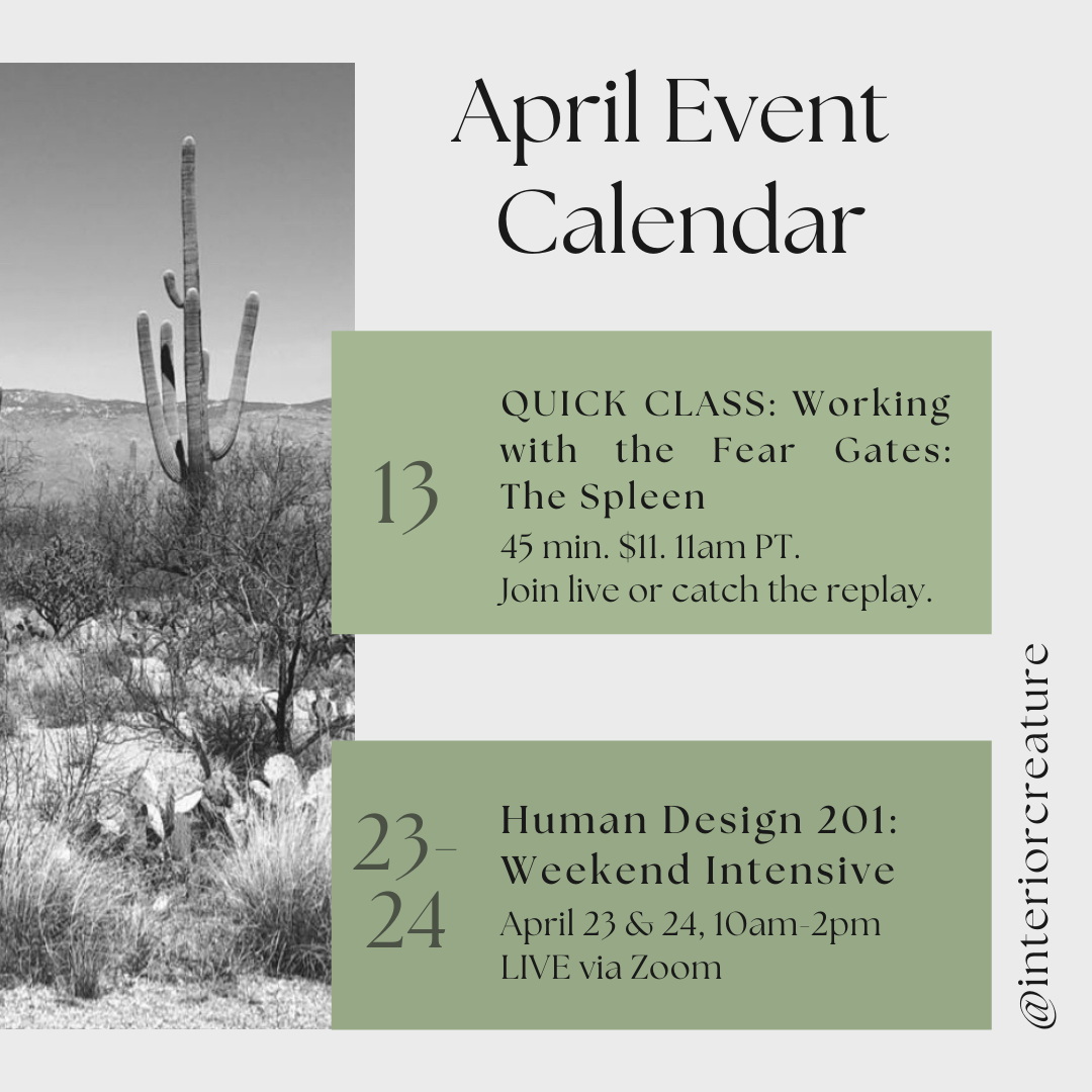 April 13th @ 11am PT is our next QUICK CLASS ✨ This month, we’re going to look closer at the seven gates of the Spleen, sometimes known as some of the Fear Gates. Over our time together, you’ll learn 1) how to identify which spleen gates you have activated in your chart, 2) about some of the most challenging fear gates and 3) how to work with that energy to walk away from the fear and into love :)