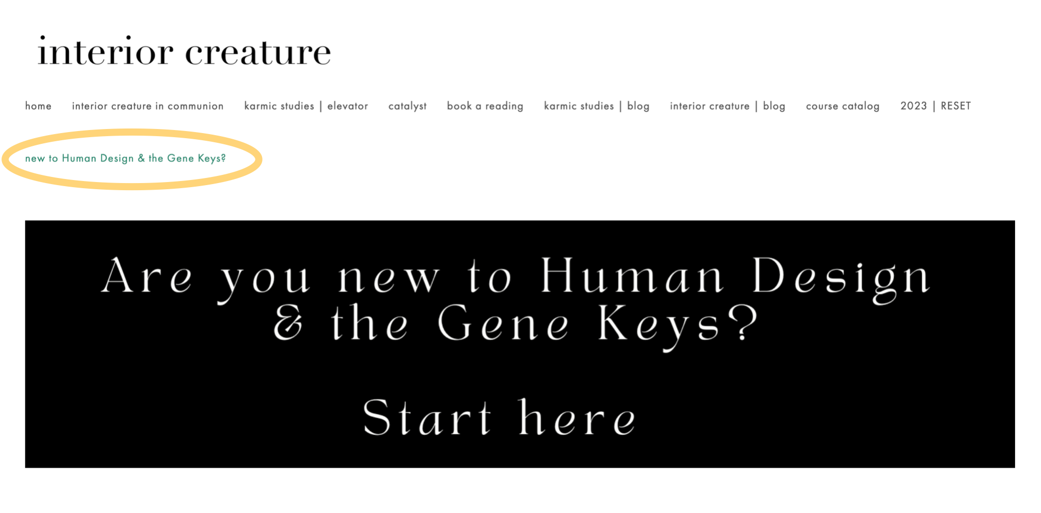 THE MASTER CLICK PATH: Up on interiorcreature.com, I created a master click path for you. To check it out, you can click the link in blue here in the previous sentence, and if you head to my website, you can click on the link on the menu bar entitled “new to Human Design & the Gene Keys?”